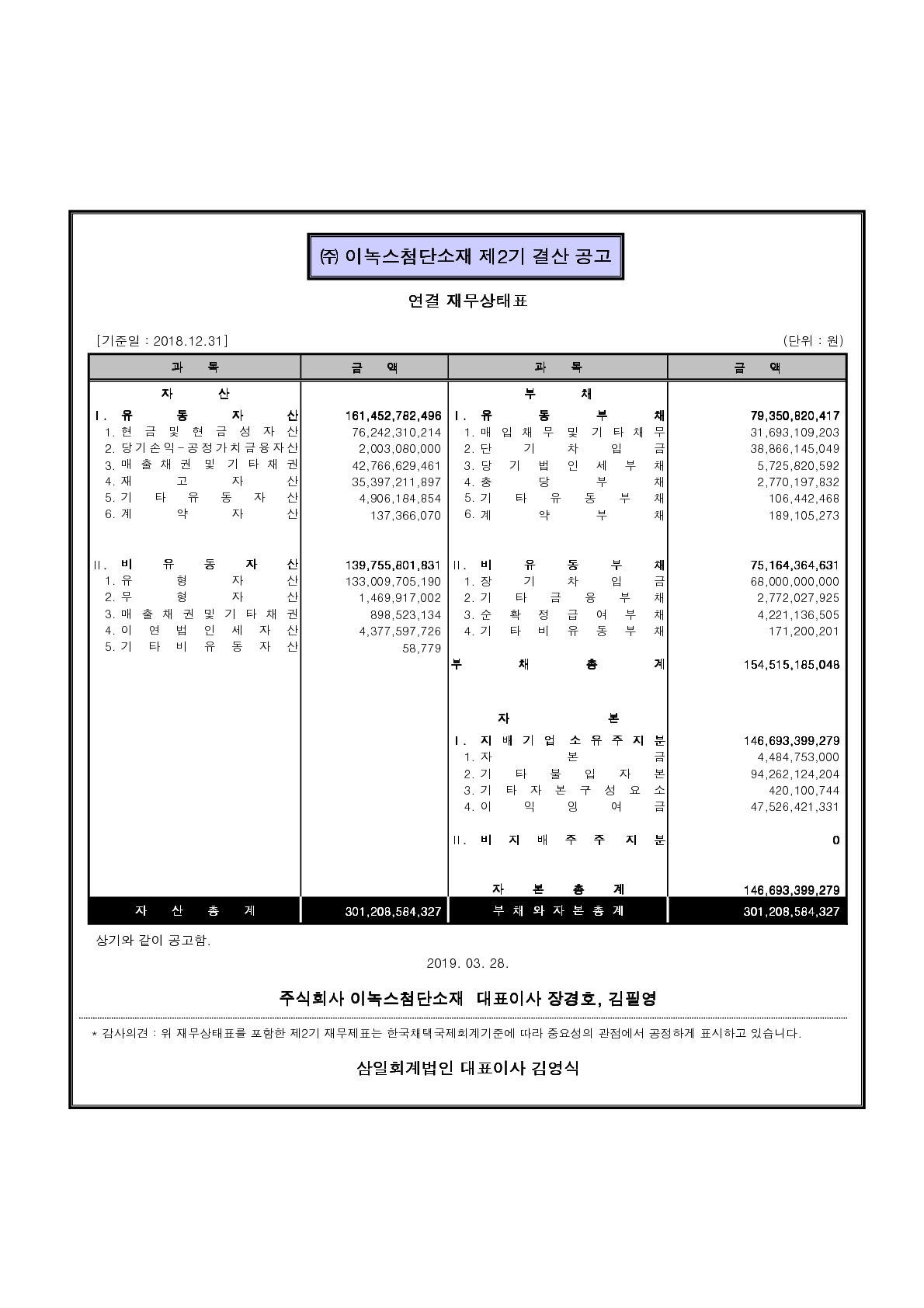 당사 정관 제 4조 및 제 52조 4항에 의거 재무상태표와 감사의견을 다음과 같이 공고하오니, 참고하시길 바랍니다.