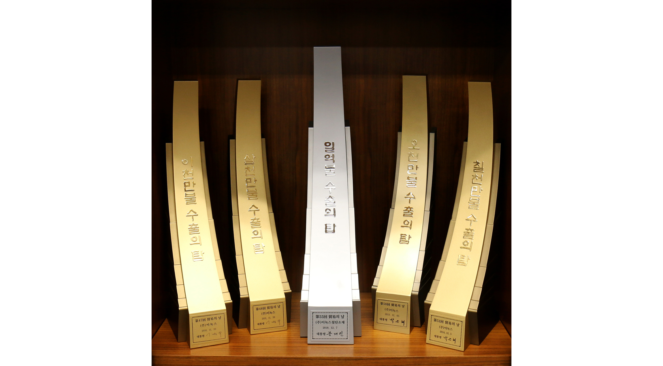 12월 7일 이녹스첨단소재는 ‘1억불 수출의 탑’을 수상하였다. 2014년 '7천만불 수출의 탑'에 이어 4년 만에 이룬 쾌거이다. 2010년 2천만불, 2011년 3천만불, 2013년 5천만불, 2014년 7천만불 수출의 탑을 받는 등 지속적인 수출 성장세를 이어가고 있다.