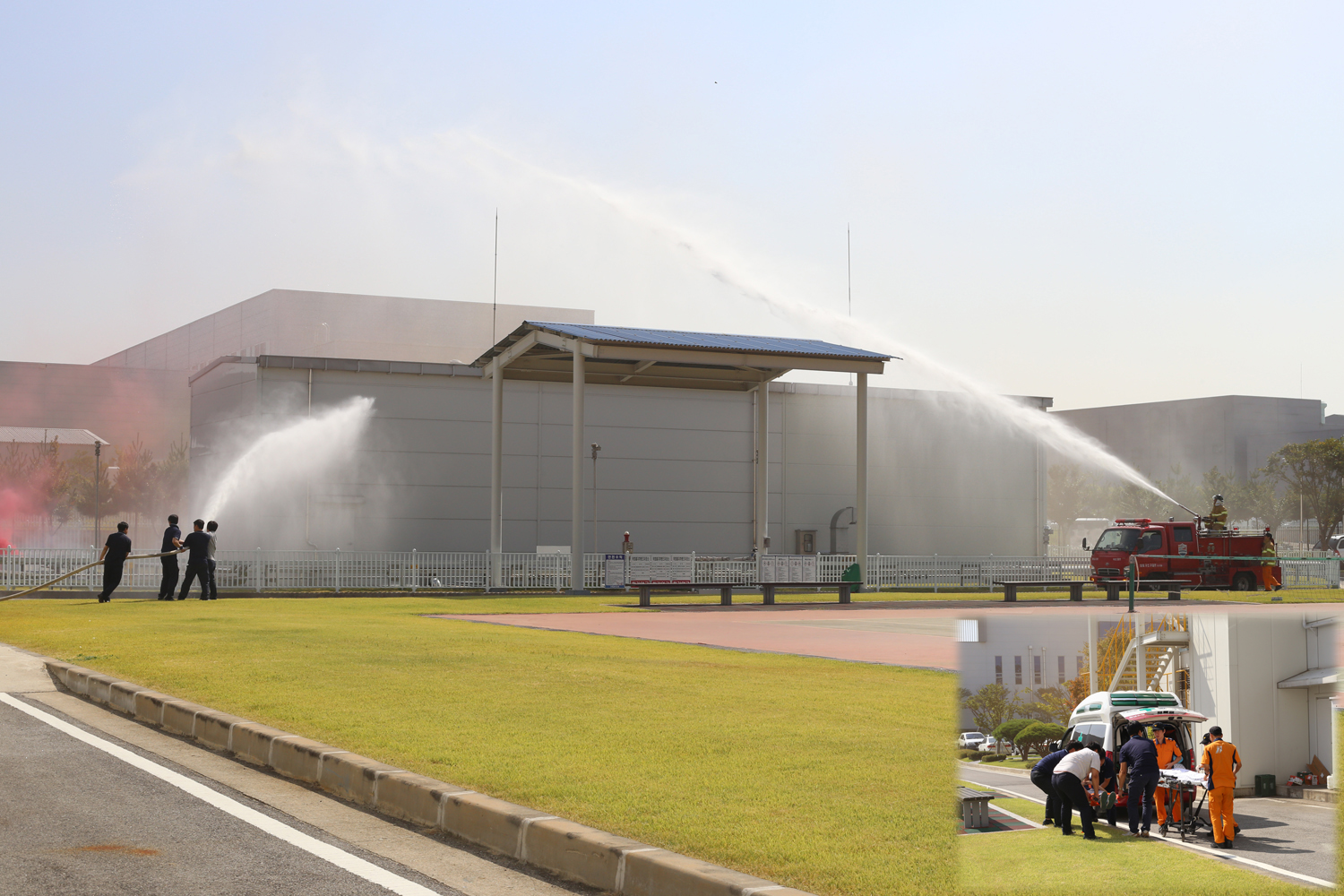 이녹스는 합동소방훈련(아산소방서, 이녹스)을 진행하였다. 아산사업장 위험물저장소에 화재가 발생한 것으로 하여 당사의 화재방생시 행동요령을 숙지하여, 대피, 화재진압(소화기 & 소화전 사용), 반출, 응급구조 훈련을 실제 상황과 같이 실시하였다. |